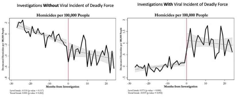 Sometimes, there are unintended consequences for just threatening to destroy an institution like the police. And there is good evidence that this may have been the case with the “abolish the police” movement. The graphs below are from a rigorous study by economists Tanaya Devi and Roland Fryer showing changes in homicide rates in 20 cities where investigations of police misconduct didn’t go viral (left) and in five cities where they did (right; “viral” means investigations in cities that gained national attention and witnessed protests and riots). Devi and Fryer’s theory for why homicide increased in cities with viral incidents is that the virality of the investigations led to police withdrawing proactive policing out of fear of becoming the target of a viral media attack.